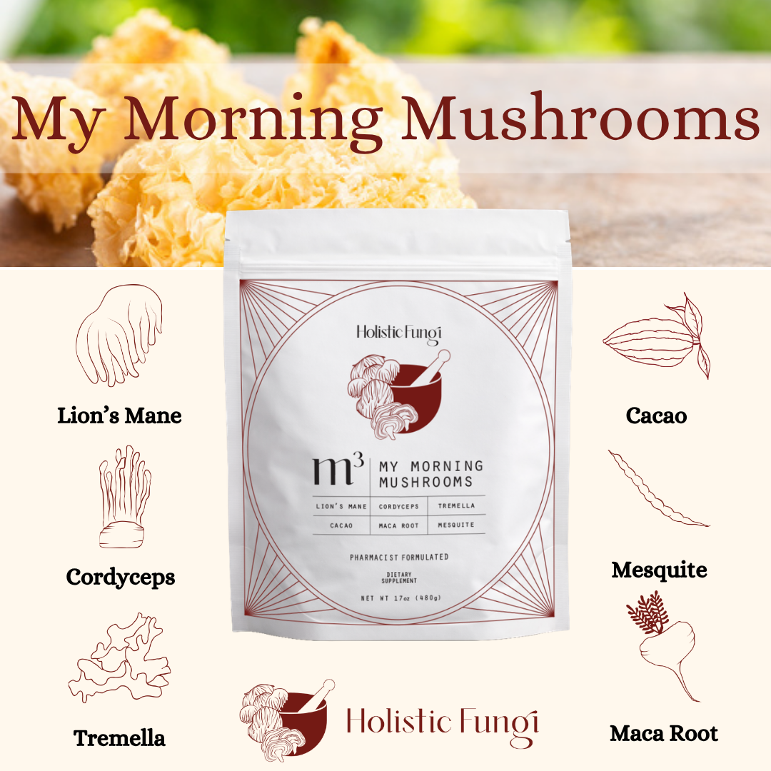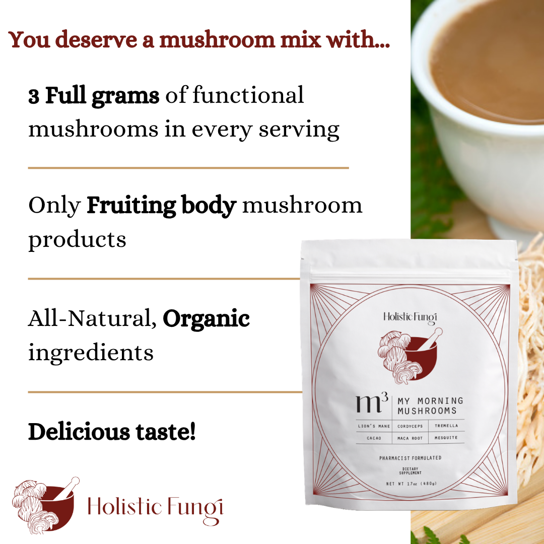 Beta-(1,3)(1,6)-glucans are naturally occurring compounds found in mushrooms. They’re one of the primary bioactive compounds studied in functional mushrooms. Each serving of m3 contains a minimum of 480mg of beta-(1,3)(1,6)-glucans.
